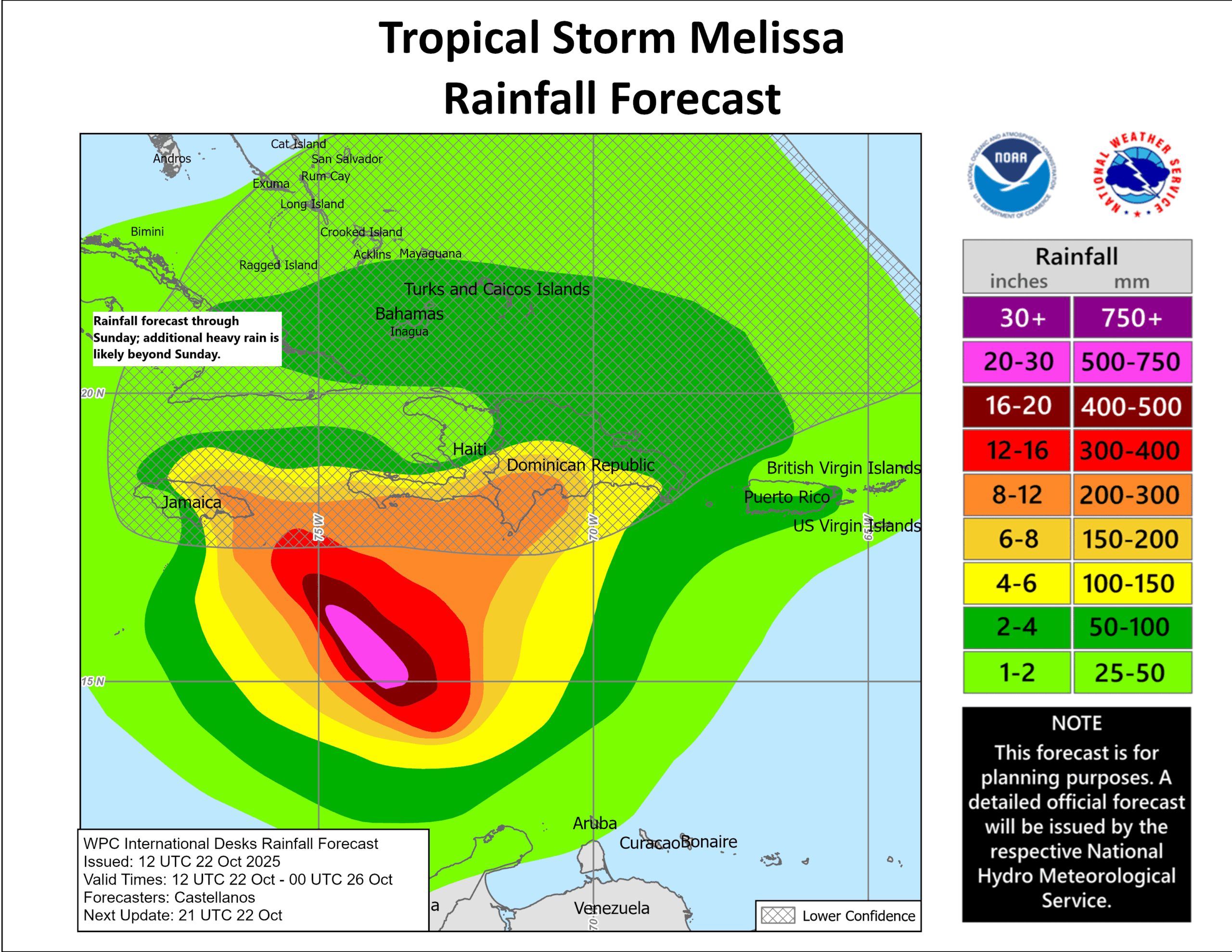 Le principal danger actuellement : des pluies torrentielle pouvant dépasser 200-300 mm (≈ 8-12 po) dans certaines zones de la partie sud de l’Île d’Hispaniola (Haïti/République Dominicaine), avec un fort risque d’inondations soudaines et de glissements de terrain.